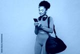 Young fitness trainer instructor sporty woman sportsman she wear orange clothes spend time in home gym hold bag use mobile cell phone isolated on plain beige background. Workout sport fit abs concept.