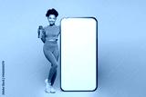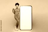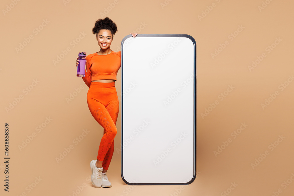 Full body young fitness trainer instructor woman wear orange clothes spend time in gym big blank screen mobile cell phone drink water isolated on plain beige background. Workout sport fit abs concept.