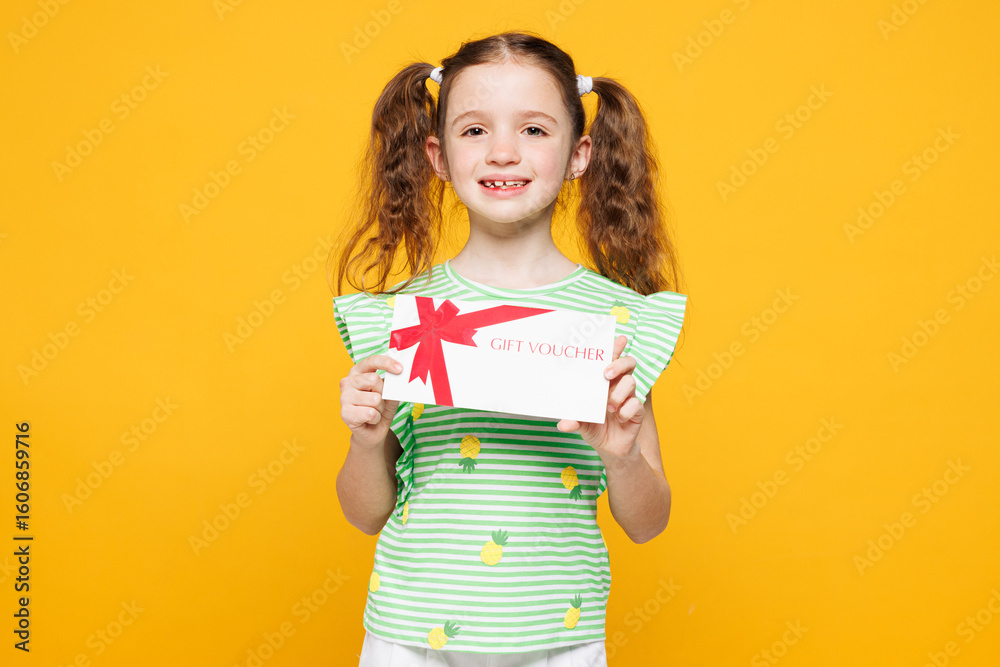 Little happy fun kid child girl 8-9 years old wears green t-shirt hold gift certificate coupon voucher card for store isolated on plain yellow background. Mother's Day love family lifestyle concept.