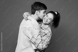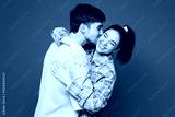 Side profile view young couple two friends family man woman they wear pink casual clothes together hug embrace cuddle kiss on cheek isolated on plain blue background studio portrait Lifestyle concept