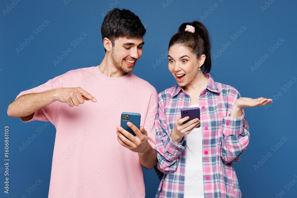 Young couple two friends family man woman they wear pink casual clothes together hold in hand use point finger on mobile cell phone isolated on plain blue background studio portrait Lifestyle concept