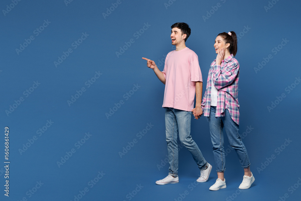 Full body side view surprised young couple two friends family man woman wear pink casual clothes together walk go point index finger aside on area isolated on plain blue background. Lifestyle concept.