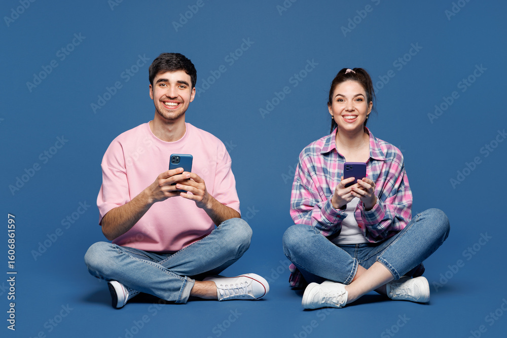 Full body young smiling couple two friends family man woman they wearing pink casual clothes together sit hold in hand use mobile cell phone isolated on plain blue background studio Lifestyle concept