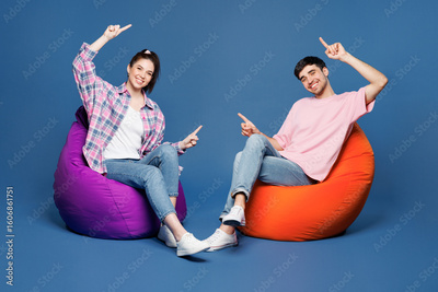 Full body young couple two friends family man woman they wear pink casual clothes together sit in bag chair point index finger on area between them isolated on plain blue background Lifestyle concept.