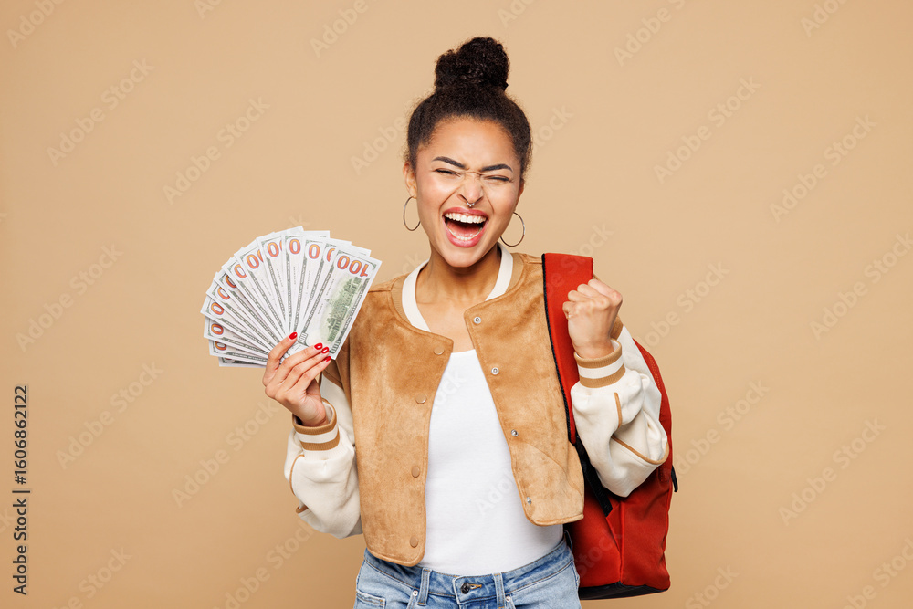 Young winner girl student wear casual clothes backpack bag hold in hand fan of cash money in dollar banknotes isolated on plain pastel light beige background. High school university college concept.