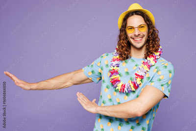 Young smiling happy cheerful Caucasian man wear blue beach t-shirt yellow hat Hawaii lei sunglasses rest near hotel pool dance isolated on plain purple background. Summer vacation sea sun tan concept.