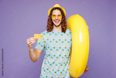 Young smiling happy man wear blue beach t-shirt yellow hat sunglasses rest near hotel pool hold rubber ring credit bank card isolated on plain purple background. Summer vacation sea sun tan concept.