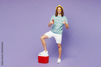 Full body young man wear t-shirt yellow hat sunglasses rest near hotel pool hold beach cooler fridge drink beer show thumb up isolated on plain purple background. Summer vacation sea sun tan concept.