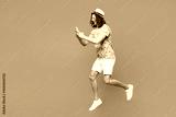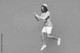 Full body young man wears blue beach t-shirt yellow hat sunglasses rest near hotel pool jump high hold use mobile cell phone isolated on plain purple background. Summer vacation sea sun tan concept.