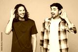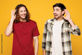 Young happy two friends buddies men they wear casual clothes together try to hear you overhear listening intently isolated on plain yellow orange color background studio portrait. Lifestyle concept.
