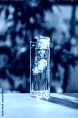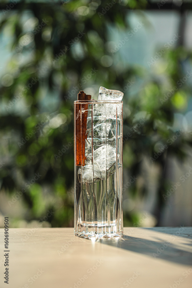 Crystal clear cocktail with ice cubes and cinnamon stick