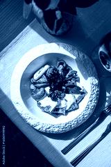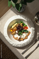 Turkey schnitzel with white sauce and grilled vegetables on white plate