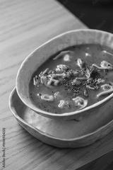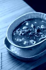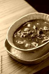 Bowl of soup with dumplings and fresh herbs on wooden table