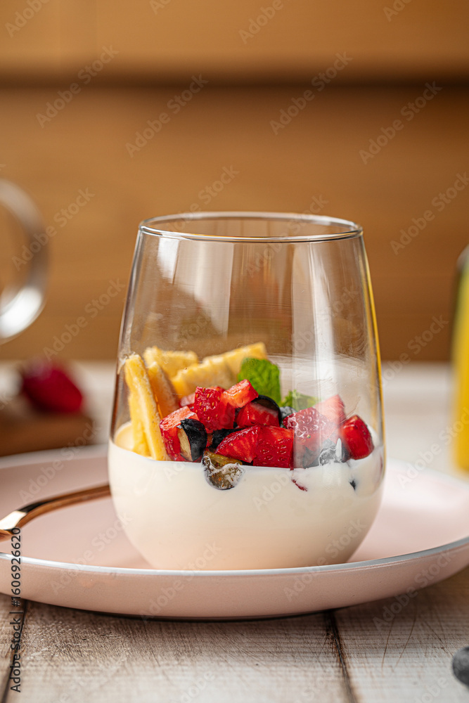Glass dessert with berries, vanilla cream and waffles served on wooden table