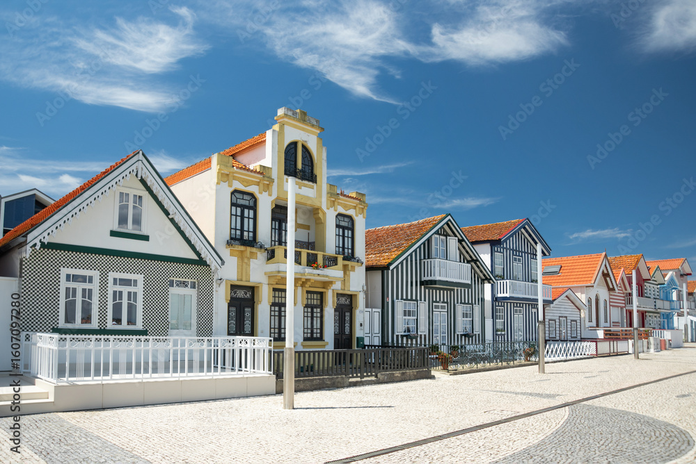 Colorful Striped Houses in Costa Nova, Aveiro, Portugal on a Sunny Day