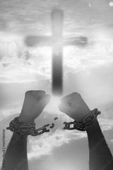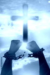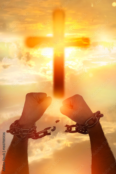 Men's hands breaking chains against the sky with a silhouette cross. Concept of christian religion