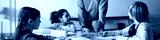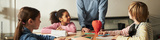 Header of group of diverse children sitting at table listening to Caucasian male teacher explaining lesson, school supplies scattered on desk, students showing attentive expressions