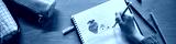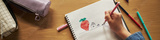 Header of child hand drawing strawberry and houses with colored pencils on spiral notebook, pencil cases, pens scattered on wooden desk, focusing on creative activity and fine motor skills development