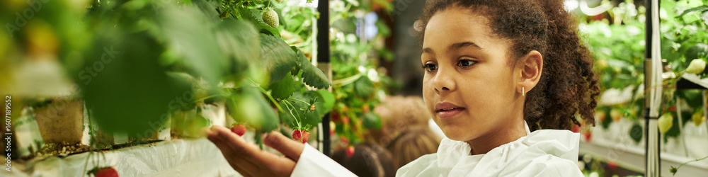 Header of Black girl examining growing strawberries in greenhouse, holding hand near ripe fruit, wearing protective clothing, focusing on plants, surrounded by green foliage and cultivation equipment
