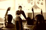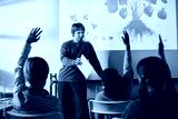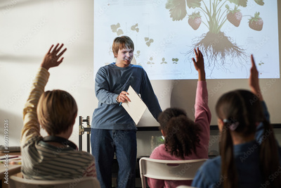 Teenage Caucasian boy standing in front of classroom holding paper, smiling and engaging with diverse group of children raising hands, botanical diagram projected on wall
