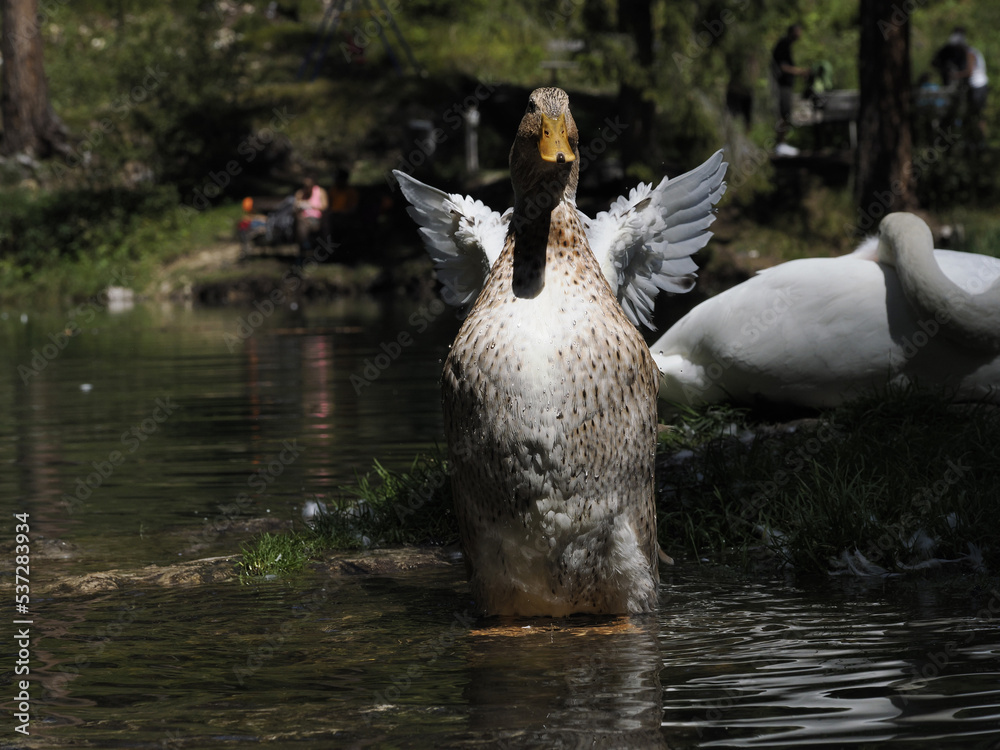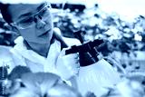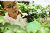 Young Caucasian woman wearing protective eyewear spraying plants with liquid using green handheld sprayer in greenhouse, focusing on plant care and pest control