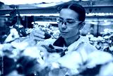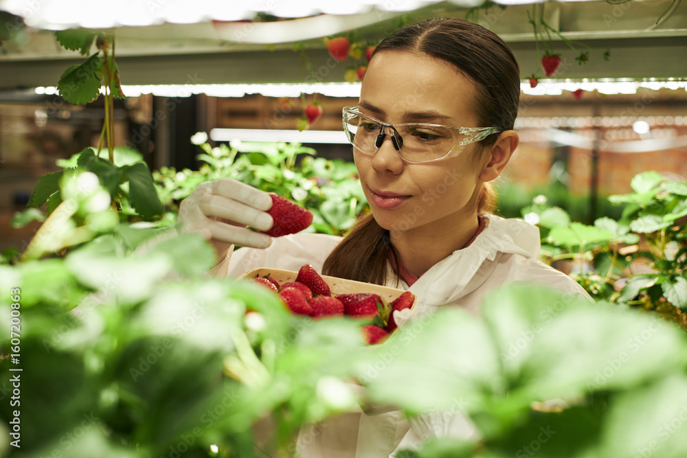 Young Caucasian woman wearing protective glasses and gloves inspecting strawberries while harvesting ripe fruit in indoor hydroponic farm, holding container filled with strawberries