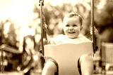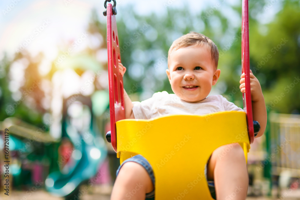 Child girl playing on outdoor playground. Kid play on school or kindergarten yard