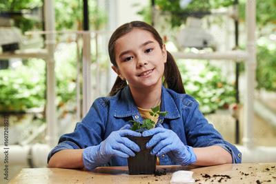 Portrait of Caucasian girl child smiling while holding potted plant with gloved hands, sitting at table in indoor garden setting, engaging in gardening activity, soil scattered on surface