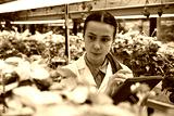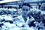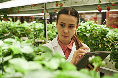 Young Caucasian woman inspecting strawberry plants in greenhouse while using digital tablet, focusing on monitoring plant growth and collecting agricultural data for research