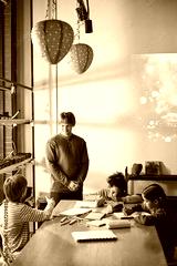 Caucasian male teacher standing near table while diverse group of children sitting and drawing with colored pencils in classroom decorated with strawberry shaped lamps