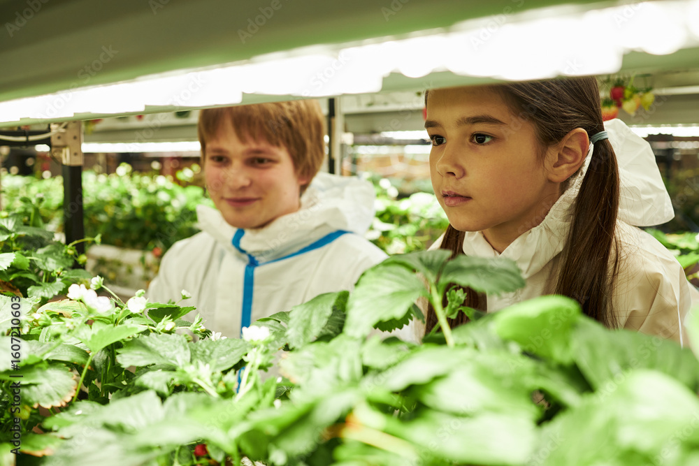 Caucasian boy and Asian girl wearing protective suits inspecting strawberry plants in indoor hydroponic farm, focusing on observing plant growth and development under artificial lighting
