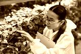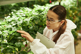 Young Asian woman inspecting strawberry plants in greenhouse while wearing protective suit and safety glasses, holding clipboard and examining leaves closely for research or quality control