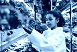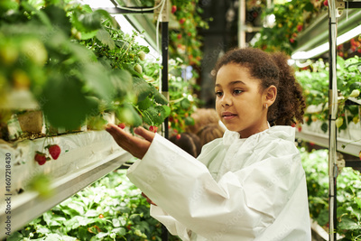Black girl child examining strawberry plants in indoor vertical farm, wearing protective lab coat, carefully inspecting ripening fruit among rows of hydroponic greenery