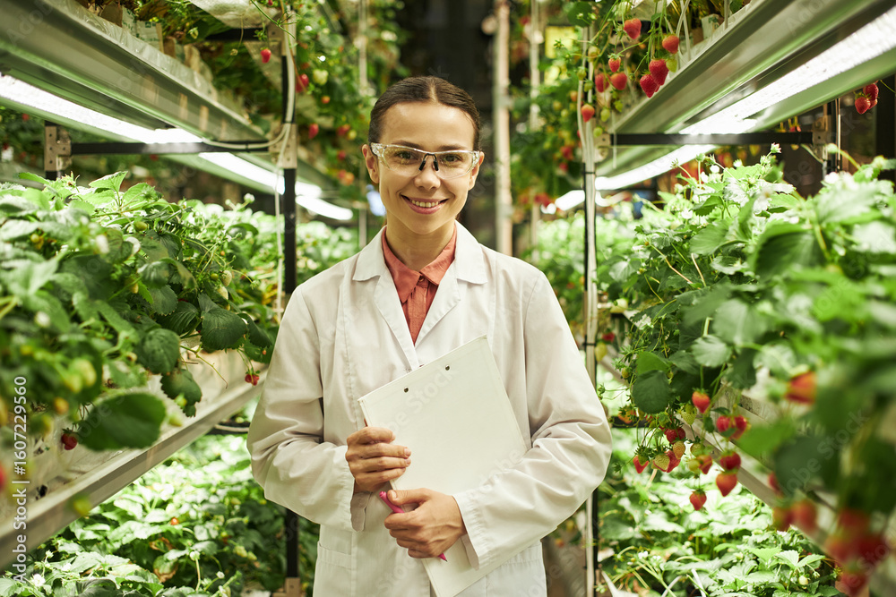 Portrait of young woman wearing safety glasses and lab coat standing in hydroponic greenhouse holding clipboard, smiling while surrounded by rows of strawberry plants