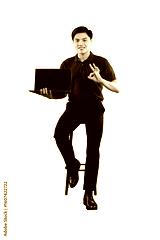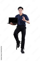 Modern Tech Presentation: A focused individual, presenting a sleek, modern laptop, perfectly captures the essence of technological advancement.
