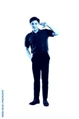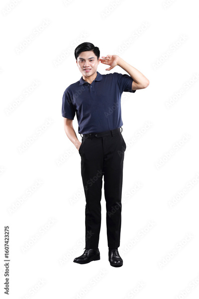 Smiling Man Posing in Casual Attire: A confident man strikes a pose, dressed in a polo shirt and trousers. capturing his composed demeanor.