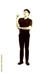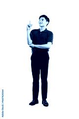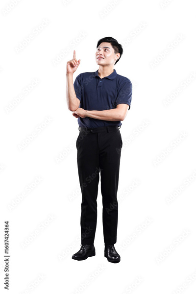 Young man pointing upward: A young man stands confidently, pointing upward with a gesture of insight or guidance, his expression radiating inspiration.