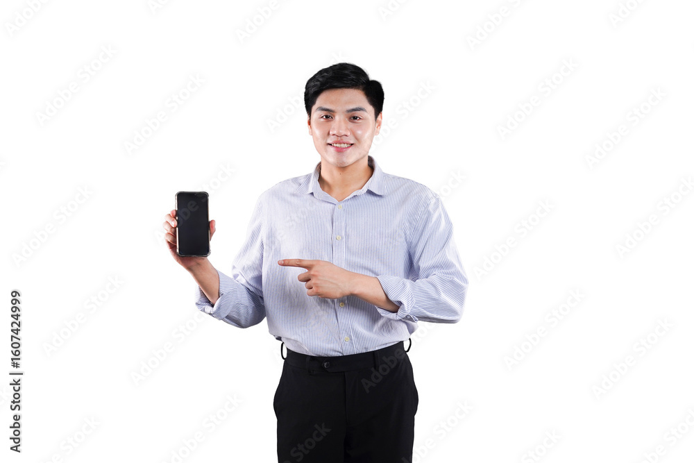 Smartphone in Hand: A confident business professional, poised in a polished presentation, holds out a smartphone, drawing attention to its modern capabilities.