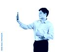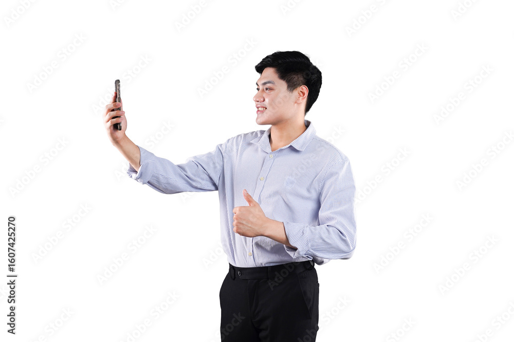 Selfie Success: A young professional man joyfully engages in a selfie session, displaying a cheerful smile and a thumbs-up gesture, capturing the essence of connectivity and modern communication.