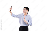 Vlogger Engaging with Audience: A cheerful man holding a smartphone, creating and broadcasting content with enthusiastic engagement.