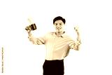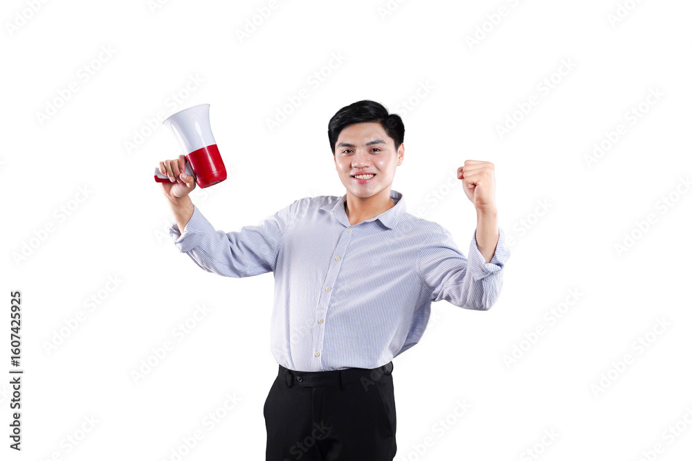 Joyful Announcement: A charismatic man, armed with a megaphone, beams with enthusiasm, radiating confidence as he delivers a crucial message