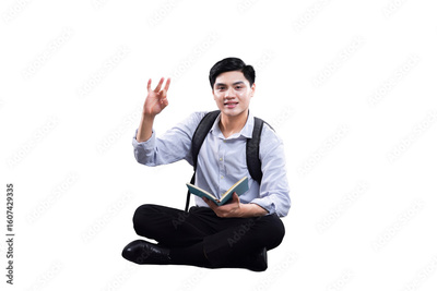 Knowledge Seeker's Pose: A young student sits with a backpack, book in hand, signaling okay or excellent, ready for the next lesson, highlighting his readiness for learning.