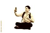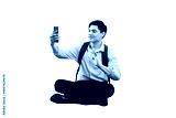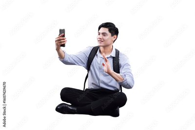 Man in Conversation: A young man, cross-legged and engrossed, holds a smartphone, seemingly engaged in a video call, exuding modern connection.