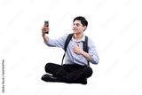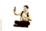 Selfie of Success: A youthful male, poised in a relaxed lotus position, beams at his smartphone, capturing a selfie, his thumb raised in a gesture of approval.