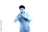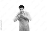 Excited Chef: A young chef, beaming with delight, gestures with hands in a moment of culinary creation, captured in a vibrant studio setting.