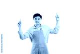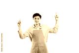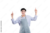 Barista's Upward Gaze: A barista, smartly dressed in an apron, with a warm smile as he points upwards, inviting a moment of aspiration and potential.