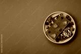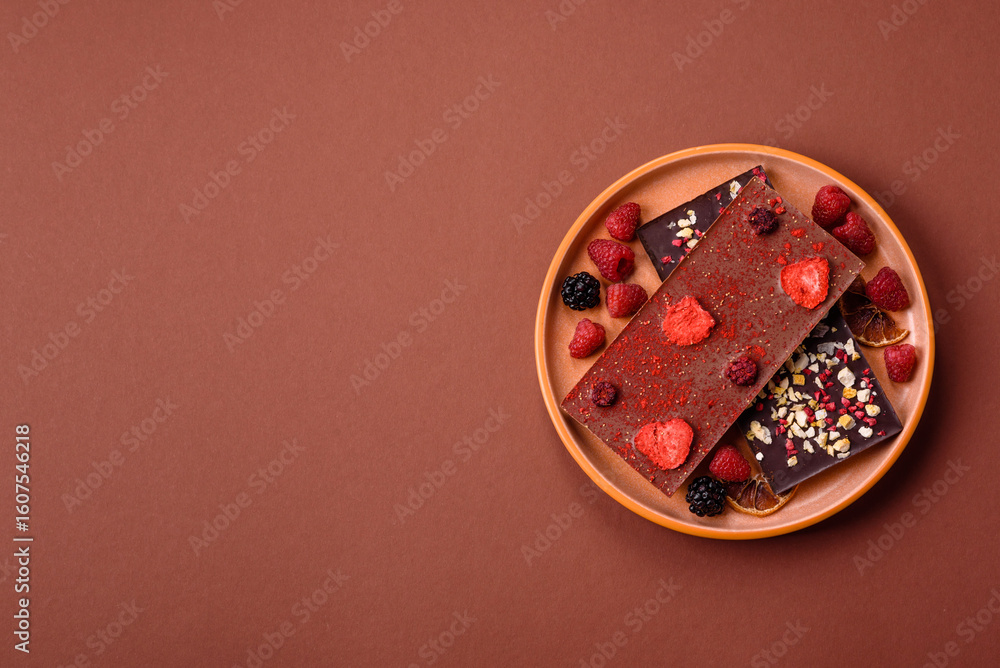 Bar sweet craft artisan chocolate with dried fruits made at home. Craft chocolate