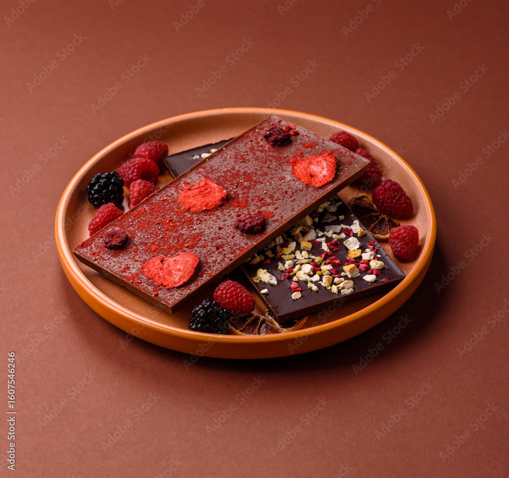 Bar sweet craft artisan chocolate with dried fruits made at home. Craft chocolate