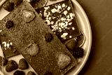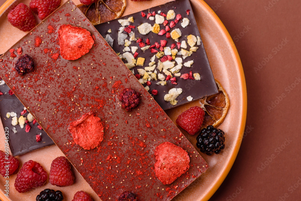 Bar sweet craft artisan chocolate with dried fruits made at home. Craft chocolate