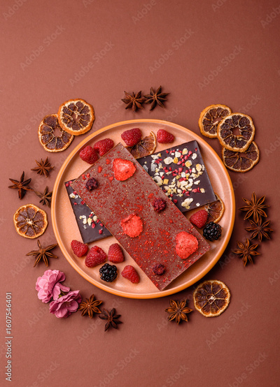 Bar sweet craft artisan chocolate with dried fruits made at home. Craft chocolate